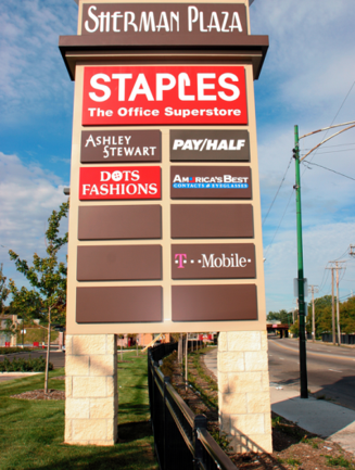 The Sherman Plaza, 60,000 sq.ft. commercial development consists of retail stores providing goods and services to the general public. With adequate parking and landscape improvements, the building consists of one continuous structure divided for perspective tenants with one additional building on an out lot near the north-west corner of the site. The construction has a steel frame with a masonry exterior that supports glass storefronts, with stone bands and metal textured panels for signage and lifestyle graphics, The site is accessible via driveways and pedestrian walkways at every point on the site. Fifty percent of the net roof area is designated for a green roof.